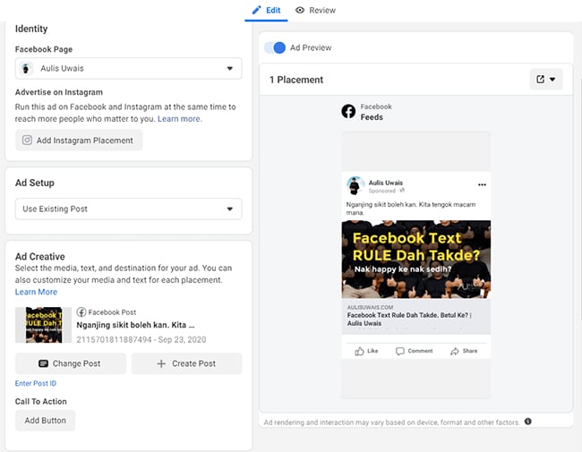 Kalau kita compare dengan iklan-iklan di platform yang lain memang tak sama macam Facebook Ads. Yelah nak tulis ayat pendek & letak info sikit die dah mention “Your ad may not run” sebab text banyak sangat dalam gambar.